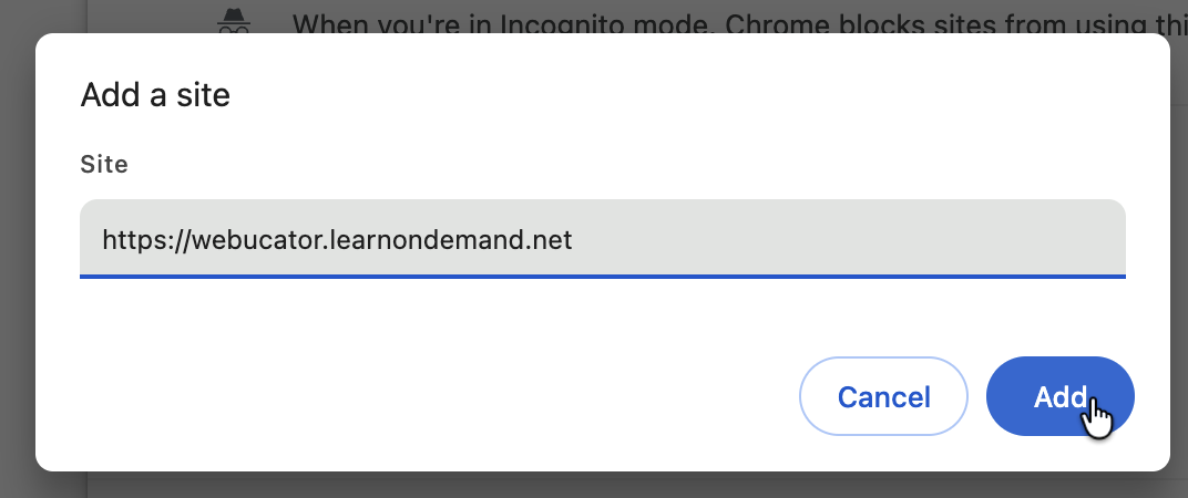 - Enter https://webucator.learnondemand.net and check Include third-party cookies on this site and then click Add.