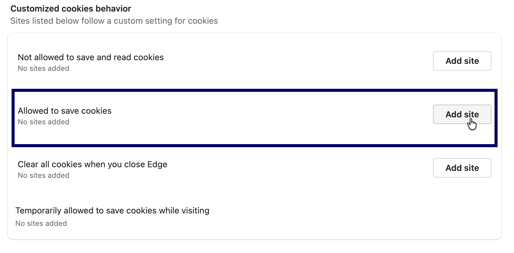 Under Customized cookies behavior, click Add site next to Allowed to save cookies: